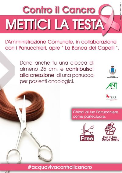 Ci sono tanti modi per essere vicini ai malati di tumore e l'amministrazione comunale di Acquaviva delle Fonti ne ha inventato uno suo - originale e a costo zero - che è piaciuto alla Lilt (Lega italiana contro i tumori), all'Ant (Associazione nazionali tumori) e ai parrucchieri acquavivesi. Da gennaio tutti gli acconciatori di Acquaviva hanno aderito al progetto "Banca dei Capelli" offrendo la colazione e il taglio ai clienti disposti a donare i propri capelli per la creazione di alcune parrucche da donare ai pazienti oncologici sottoposti a chemioterapia. I coiffeur aderenti all'iniziativa provvederanno a consegnare il materiale raccolto alla Calviclinica, un'azienda di Bari specialista del settore, che provvederà gratuitamente alla realizzazione delle parrucche. Attenzione però: il taglio minimo dovrà essere di 25 centimetri, al di sotto di questa lunghezza non è possibile infatti lavorare i capelli.