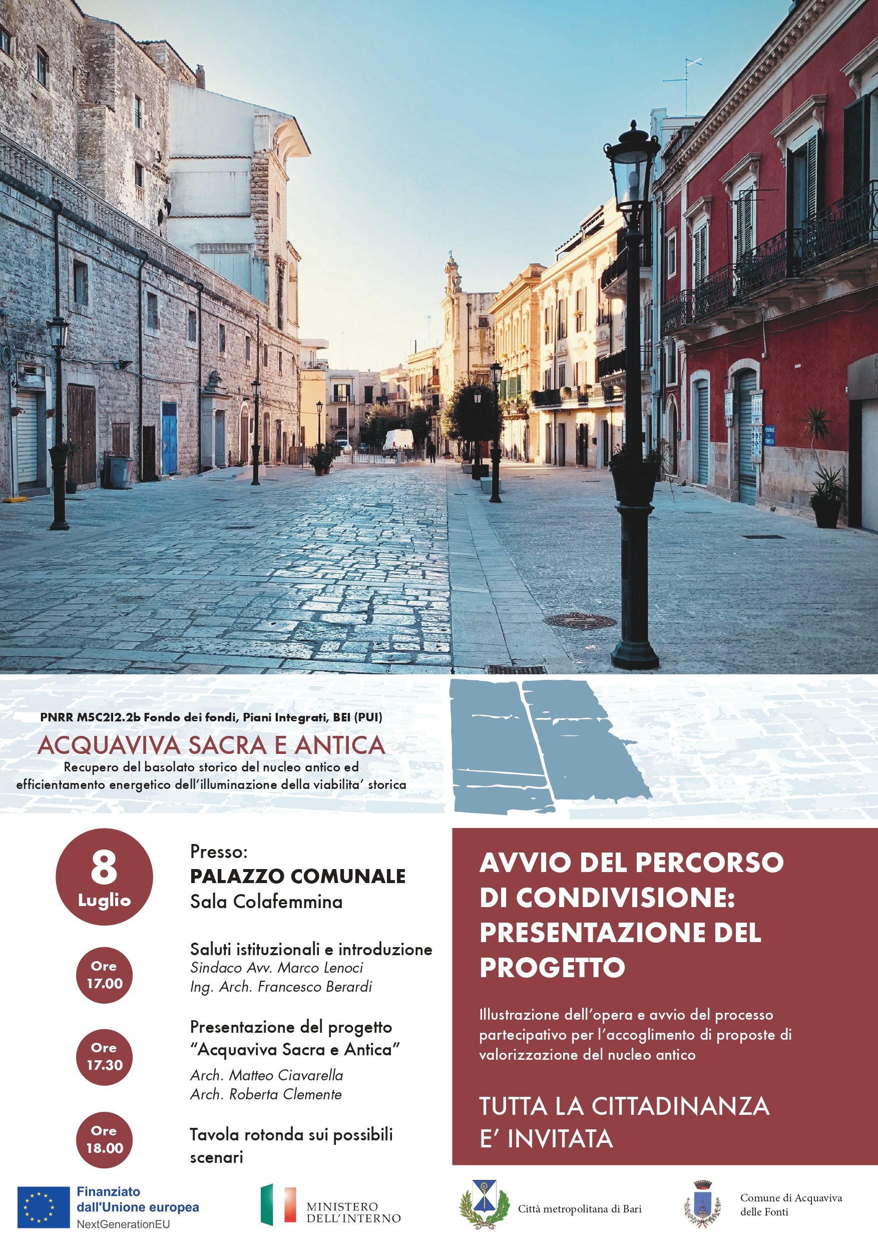 Prende il via il percorso di condivisione del progetto “Acquaviva sacra e antica”, finanziato nell’ambito dei fondi PNRR MSC21.2b, dedicato al recupero del basolato storico del nucleo antico e all’efficientamento energetico dell’illuminazione della viabilità storica.